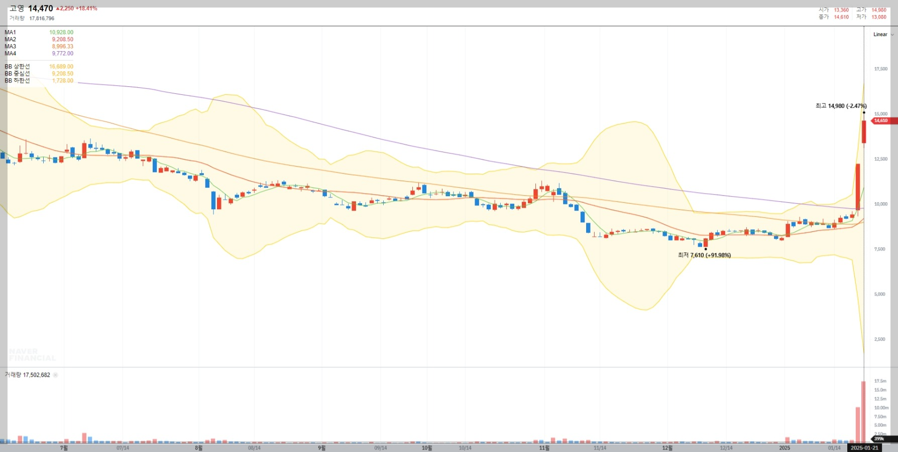 2025년 1월 20일 기준, 고영의 현재 주가는 14,470원으로 전일 대비 18.41% 상승했습니다. 이는 FDA 승인 기대감과 AI 솔루션 수요 증가에 따른 투자 심리 개선 때문으로 보입니다.