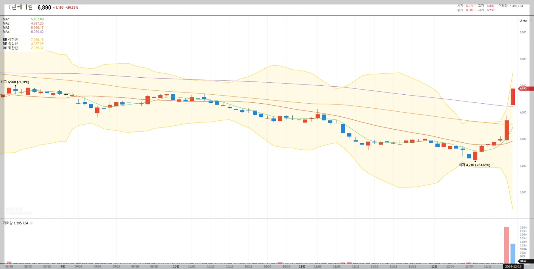 2024년 12월 18일 현재, 그린케미칼은 최근 급등세를 보이며 투자자들의 관심을 받고 있습니다. 이번 글에서는 그린케미칼의 기업 개요, 최근 뉴스, 현재 주가 동향, 배당금 정보, 그리고 볼린저밴드 매매기법을 활용한 분석을 통해 주가 전망과 목표 주가를 살펴보겠습니다.