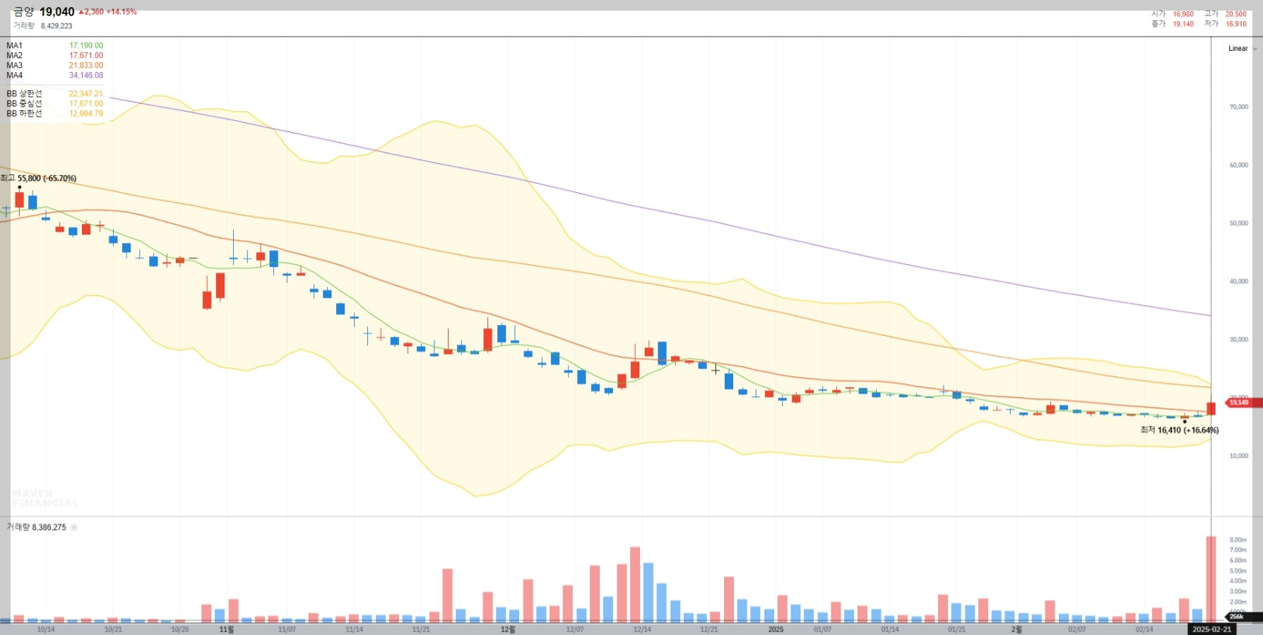 2025년 2월 21일 기준 금양의 현재 주가는 19,040원으로 전일 대비 14.15% 상승했습니다. 이는 단기적인 기술적 반등일 가능성이 높으며, 장기적 추세는 여전히 하락세를 유지하고 있습니다.