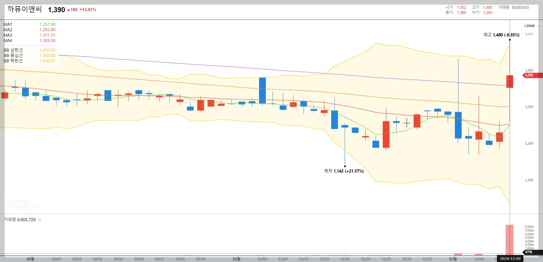 2024년 12월 기준 까뮤이앤씨의 주가는 1,390원으로 전일 대비 13.01% 상승했습니다. 이는 최근 수주 소식과 더불어 투자 심리가 개선된 결과로 보입니다.