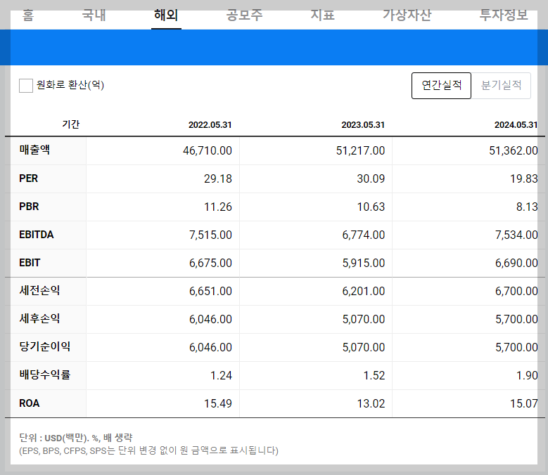 나이키의 최신 재무 지표를 확인해 보면, 매출은 510억 달러, 순이익은 53억 달러, 주당순이익(EPS)은 3.51달러입니다.