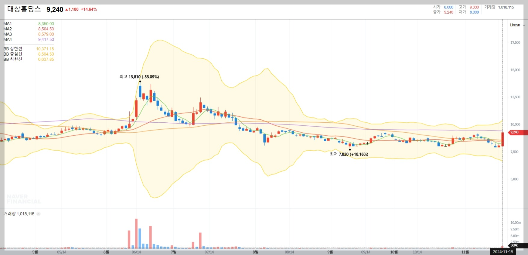 2024년 11월 15일 기준으로 대상홀딩스의 주가는 9,240원으로 전일 대비 14.64% 상승했습니다. 최근 한동훈 법무부 장관과 연관된 테마주로 급등세를 보였으나 이후 하락세를 겪고 있습니다.