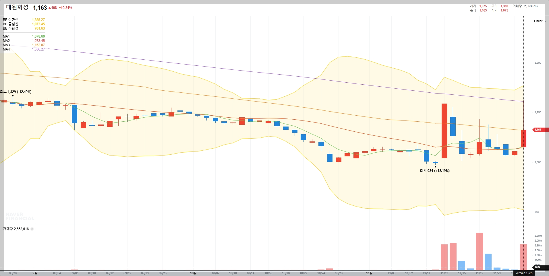현재 대원화성의 주가는 1,163원으로 거래되고 있으며, 최근 몇 달간 변동성이 높은 모습을 보였습니다. 볼린저밴드 상 하단선 사이에서 움직이며 기술적 분석의 중요성이 부각되고 있습니다.