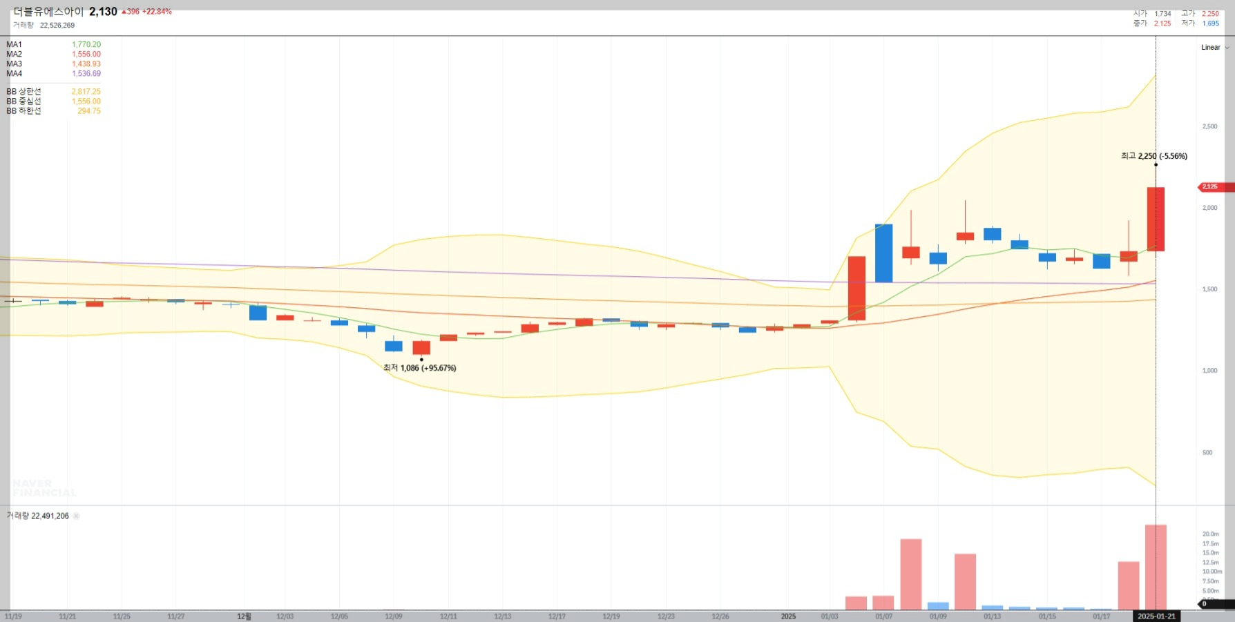 2025년 1월 21일 기준 더블유에스아이의 주가는 2,130원으로 전일 대비 22.84% 상승했습니다. 최근 수술용 로봇 상용화 소식이 투자 심리를 자극하며 급등세를 보이고 있습니다.