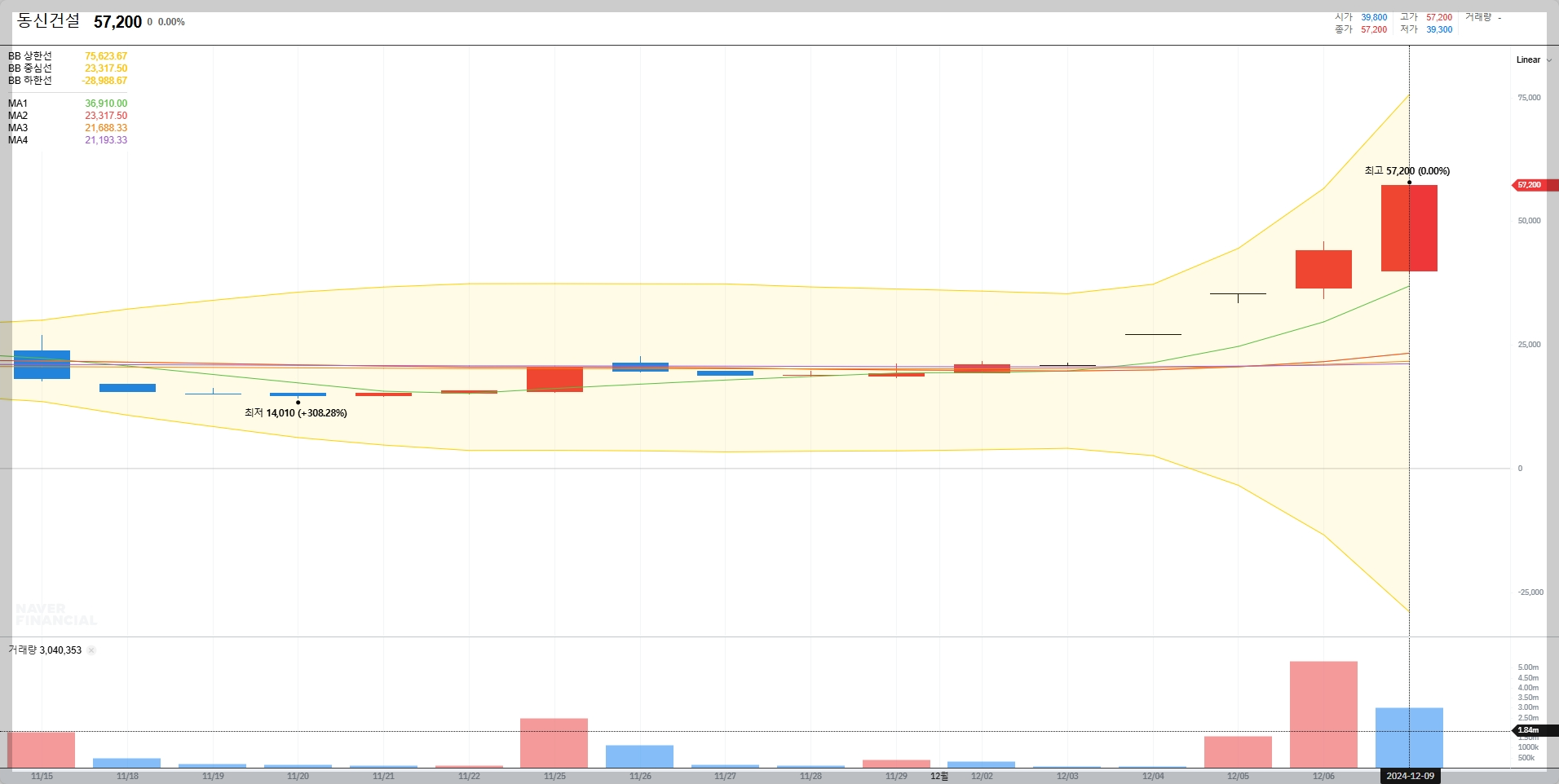 현재 동신건설의 주가는 57,200원으로 기록되었습니다. 이는 지난 11월 최저점인 14,010원 대비 약 308% 상승한 수치로 강력한 상승세를 보여주고 있습니다.