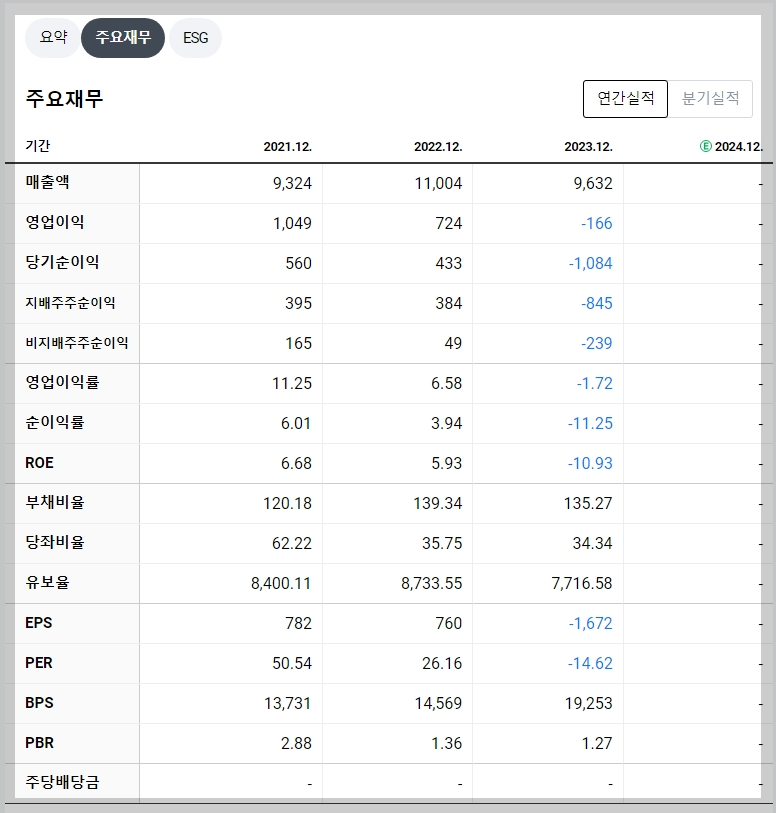 2023년 동화기업의 매출액은 9,632억 원으로 전년 대비 감소했으며, 영업이익은 -166억 원, 순이익은 -1,084억 원으로 적자를 기록했습니다. 부채비율은 135.27%로 안정적인 수준을 유지하고 있으나, 수익성 지표인 ROE는 -10.93%로 부진합니다.