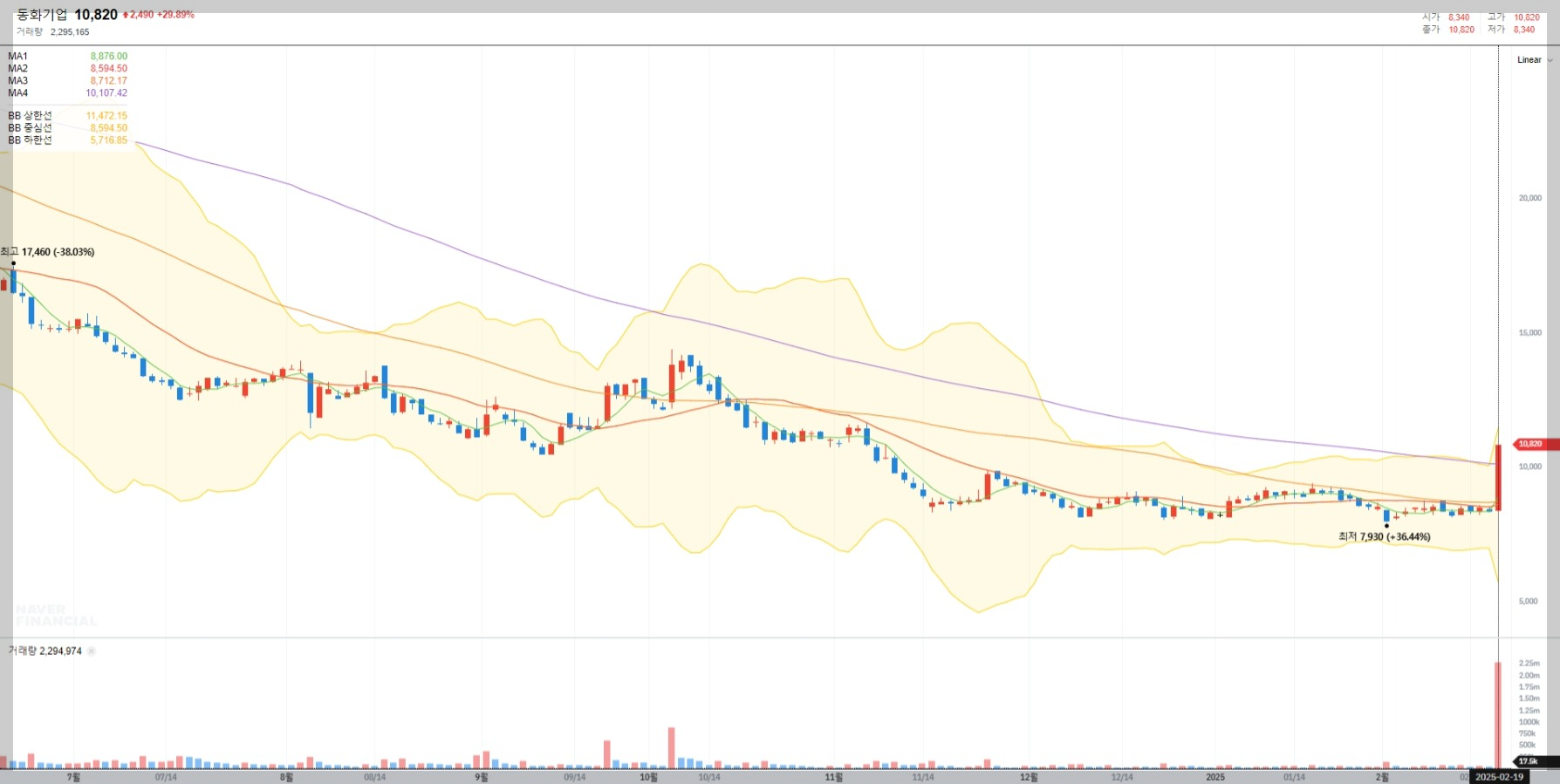 2025년 2월 19일 기준 동화기업의 현재 주가는 10,820원으로 전일 대비 29.89% 급등했습니다. 이는 단기적인 기술적 반등으로 보이며, 거래량 또한 크게 증가하여 투자자들의 관심이 집중되고 있음을 보여줍니다.