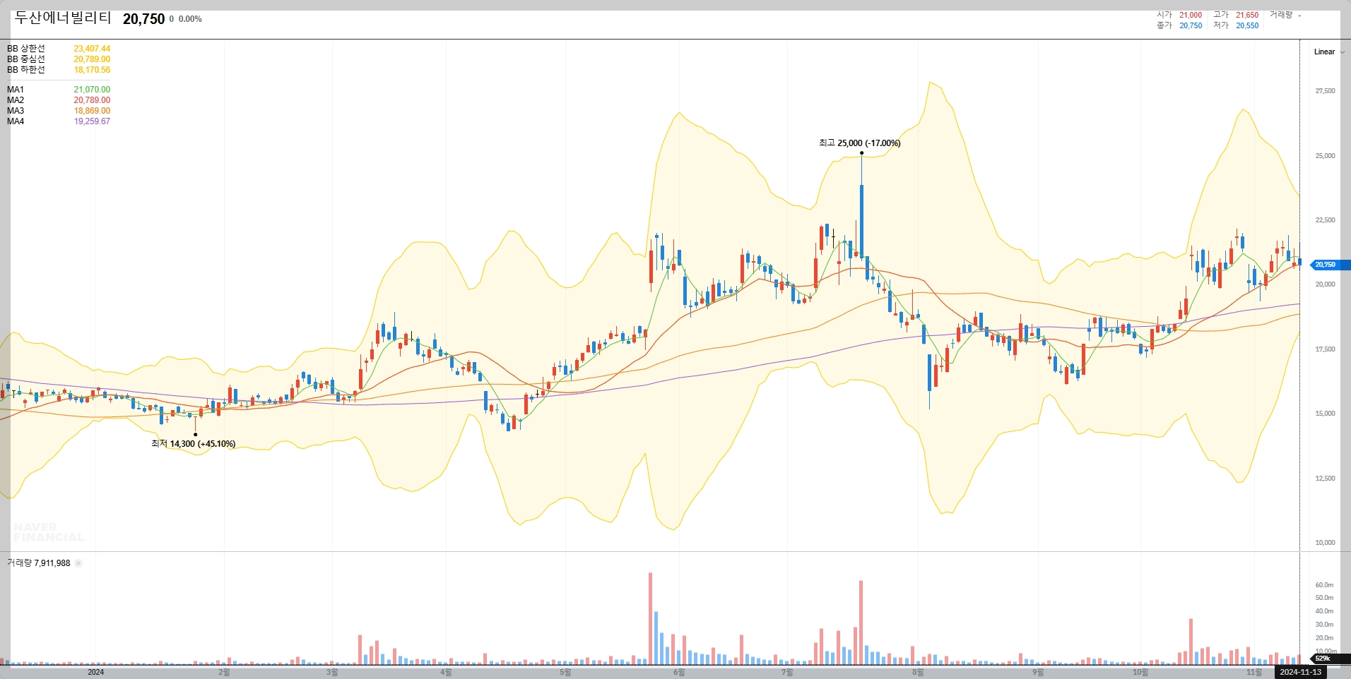 2024년 11월 기준, 두산에너빌리티의 주가는 약 20,750원으로 거래되고 있으며, 최근 몇 달간 꾸준한 상승세를 보였습니다. 특히 52주 최고가는 25,000원으로 기록되었으며, 최저가는 14,300원으로 나타났습니다. 거래량 또한 활발하게 유지되고 있어 투자자들의 관심이 높아지고 있습니다.