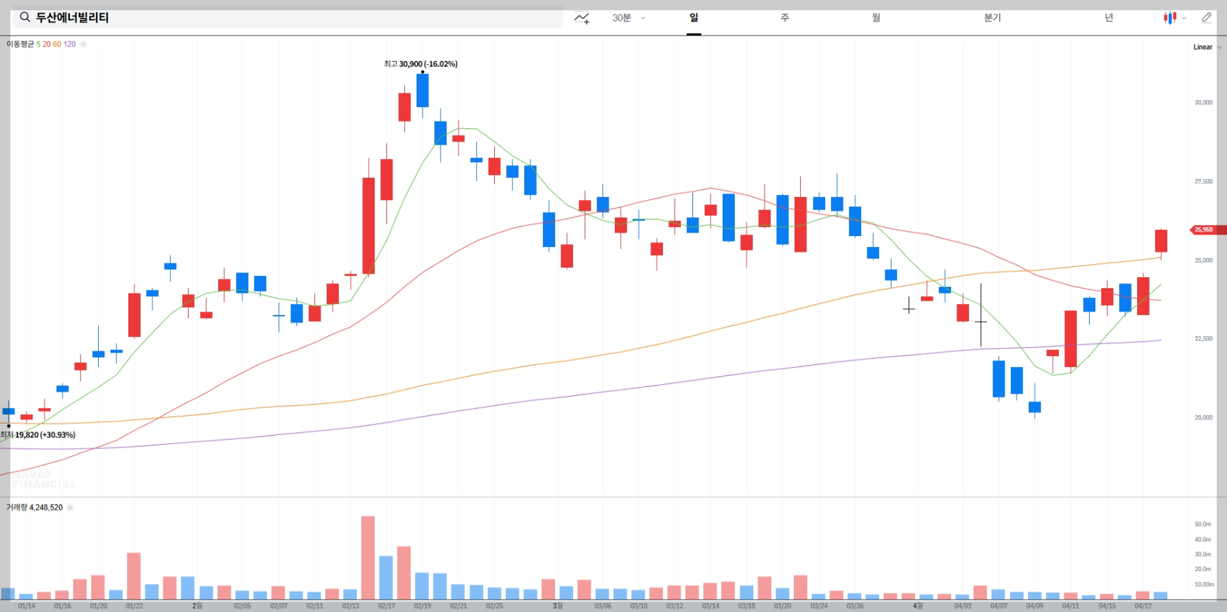 2025년 4월 18일 기준 두산에너빌리티의 주가는 25,900원으로, 전일 대비 1,450원(+5.93%) 상승했습니다. 최근 주가 흐름을 살펴보면 꾸준한 상승세를 보이고 있습니다.