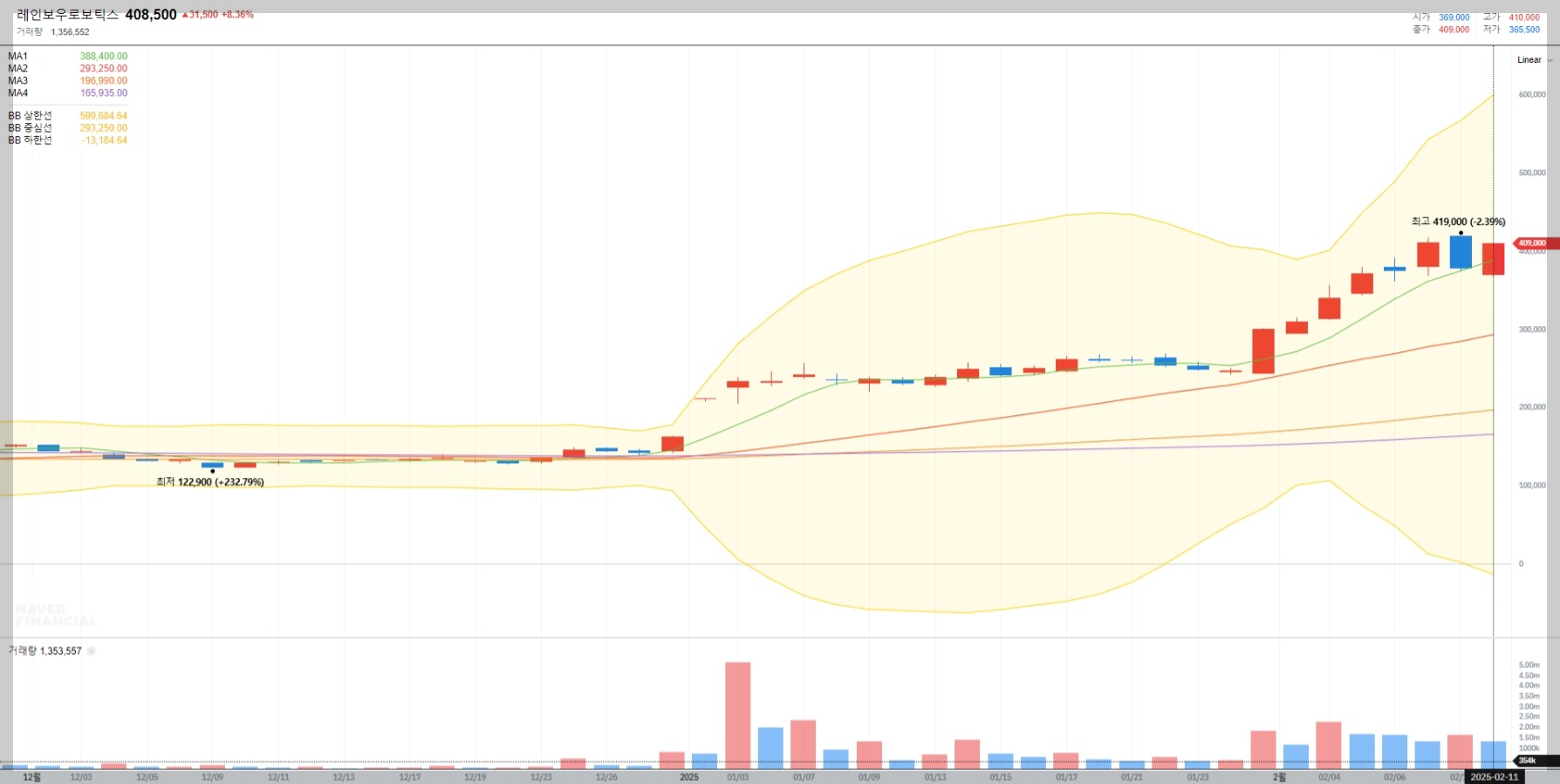 2025년 2월 11일 기준, 레인보우로보틱스의 현재 주가는 408,500원으로 기록되었습니다. 이는 전일 대비 8.36% 상승한 수치로, 최근 강한 매수세와 함께 볼린저밴드 상단을 돌파하며 강세 흐름을 이어가고 있습니다.