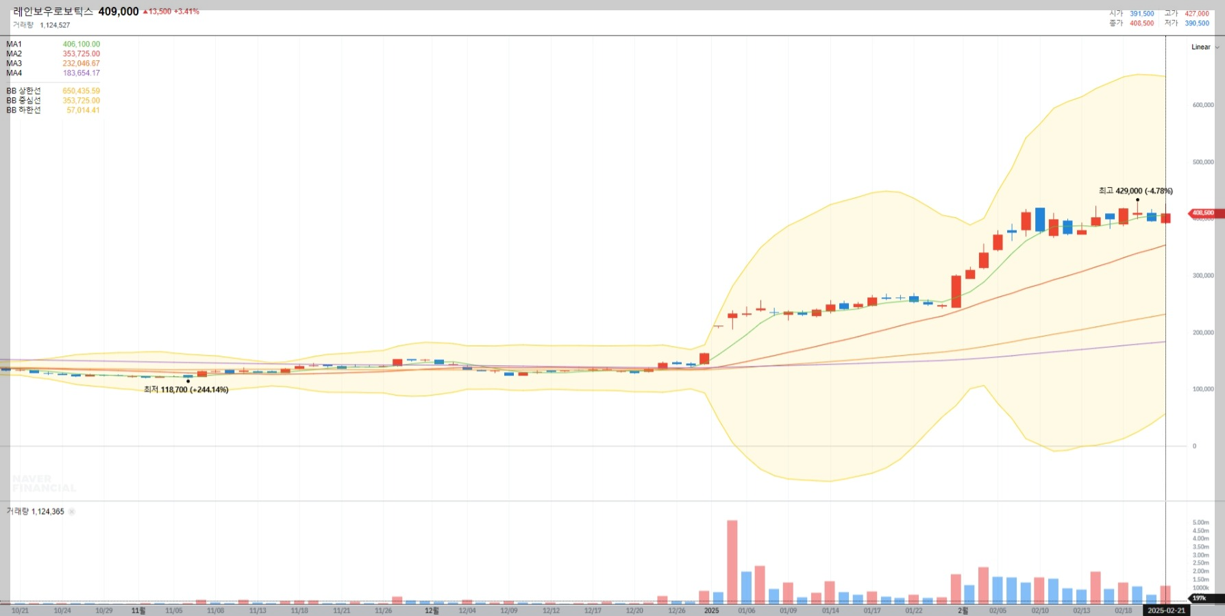 2025년 2월 21일 기준 레인보우로보틱스의 주가는 409,000원으로 기록되었습니다. 이는 단기간에 큰 상승세를 보이며 투자자들에게 높은 기대감을 안겨주고 있습니다. 거래량 또한 증가세를 보이며 시장의 관심이 집중되고 있음을 알 수 있습니다.