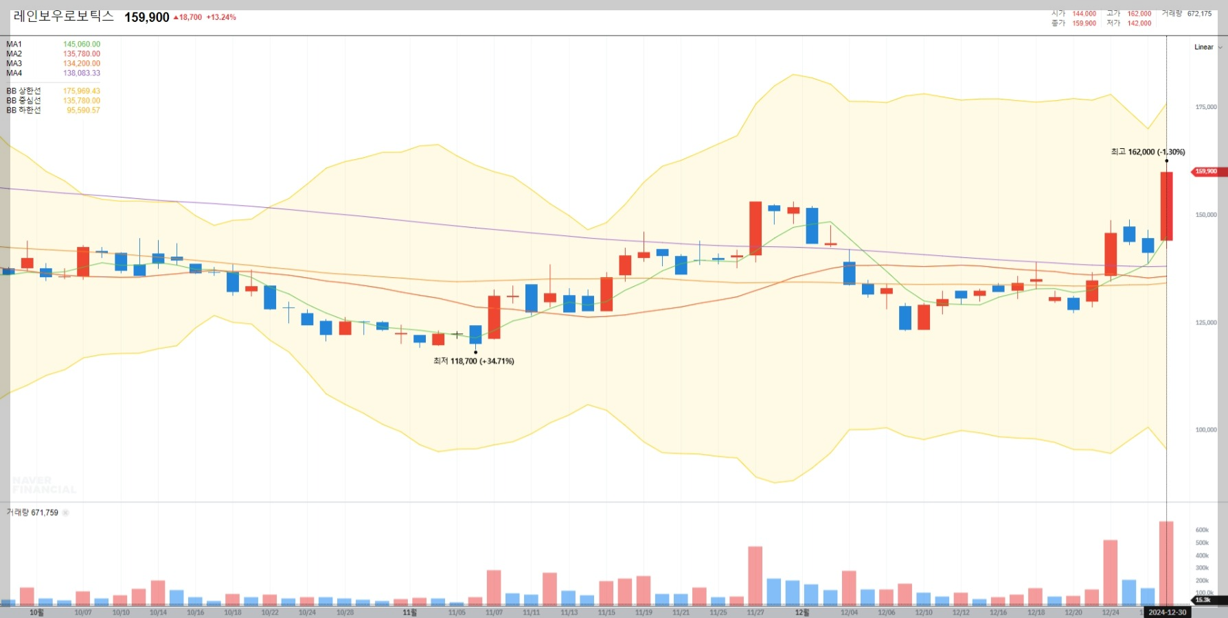 2024년 12월 30일 기준 레인보우로보틱스의 주가는 159,900원으로 전일 대비 13.24% 상승했습니다. 최근 거래량 증가와 함께 상승세를 보이며 투자자들의 기대감을 반영하고 있습니다.