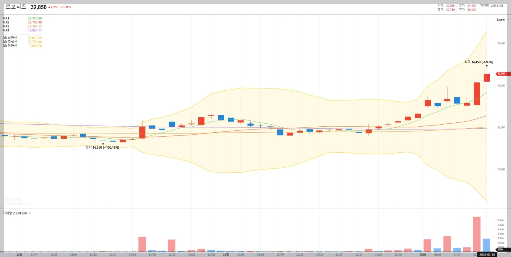 볼린저밴드 분석에 따르면 현재 로보티즈의 주가는 상단 밴드를 돌파하며 강한 상승세를 보이고 있습니다. 이는 단기적으로 과매수 구간에 진입했음을 시사하지만, 추세 지속 가능성도 염두에 두어야 합니다.