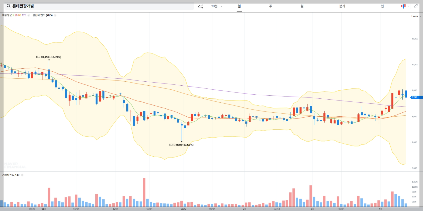 2025년 4월 10일 기준, 롯데관광개발의 주가는 8,730원을 기록하고 있습니다. 전일 대비 80원(-0.91%) 하락한 수치입니다. 주가는 최근 변동성을 보이고 있으며, 투자자들의 관심이 집중되고 있습니다.