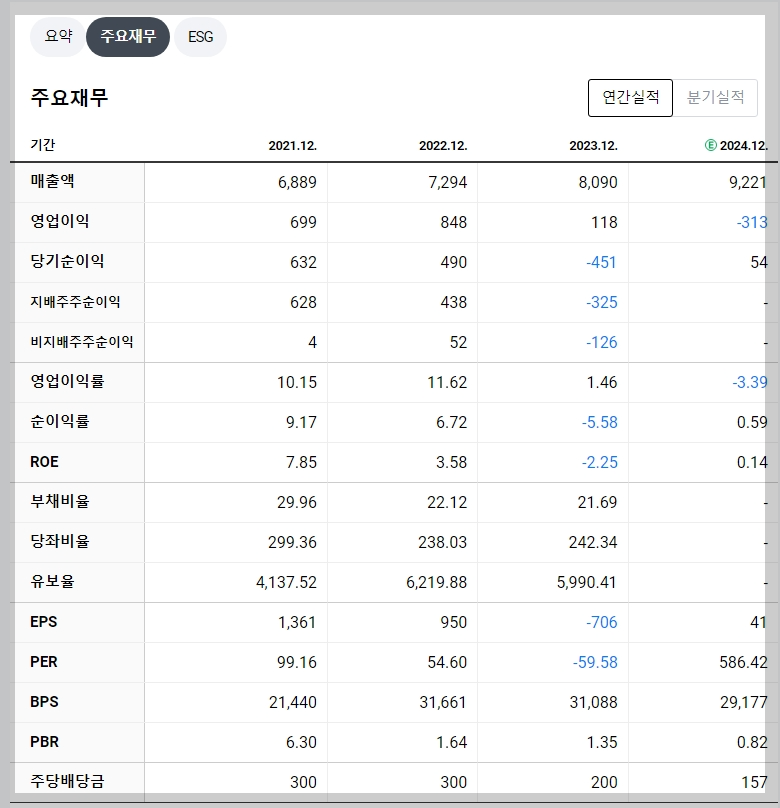 최근 재무 데이터를 보면 2023년 영업이익은 118억 원으로 급감했으며 순이익률 역시 -5.58%로 적자를 기록했습니다. 그러나 2024년에는 개선 가능성이 있으며 매출액은 9,221억 원으로 증가할 것으로 예상됩니다.