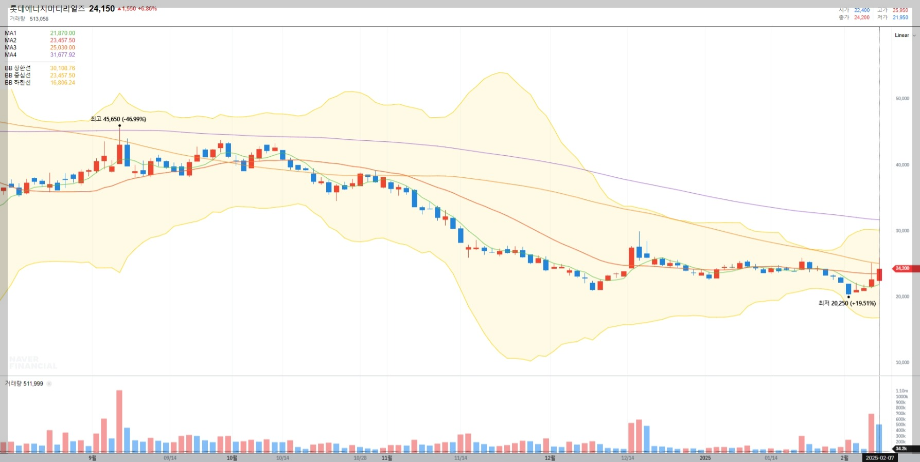 2025년 2월 7일 기준 롯데에너지머티리얼즈의 현재 주가는 24,150원으로 전일 대비 6.86% 상승했습니다. 최근 몇 달간 하락세를 보였으나 기술적 반등 가능성이 점쳐지고 있습니다.