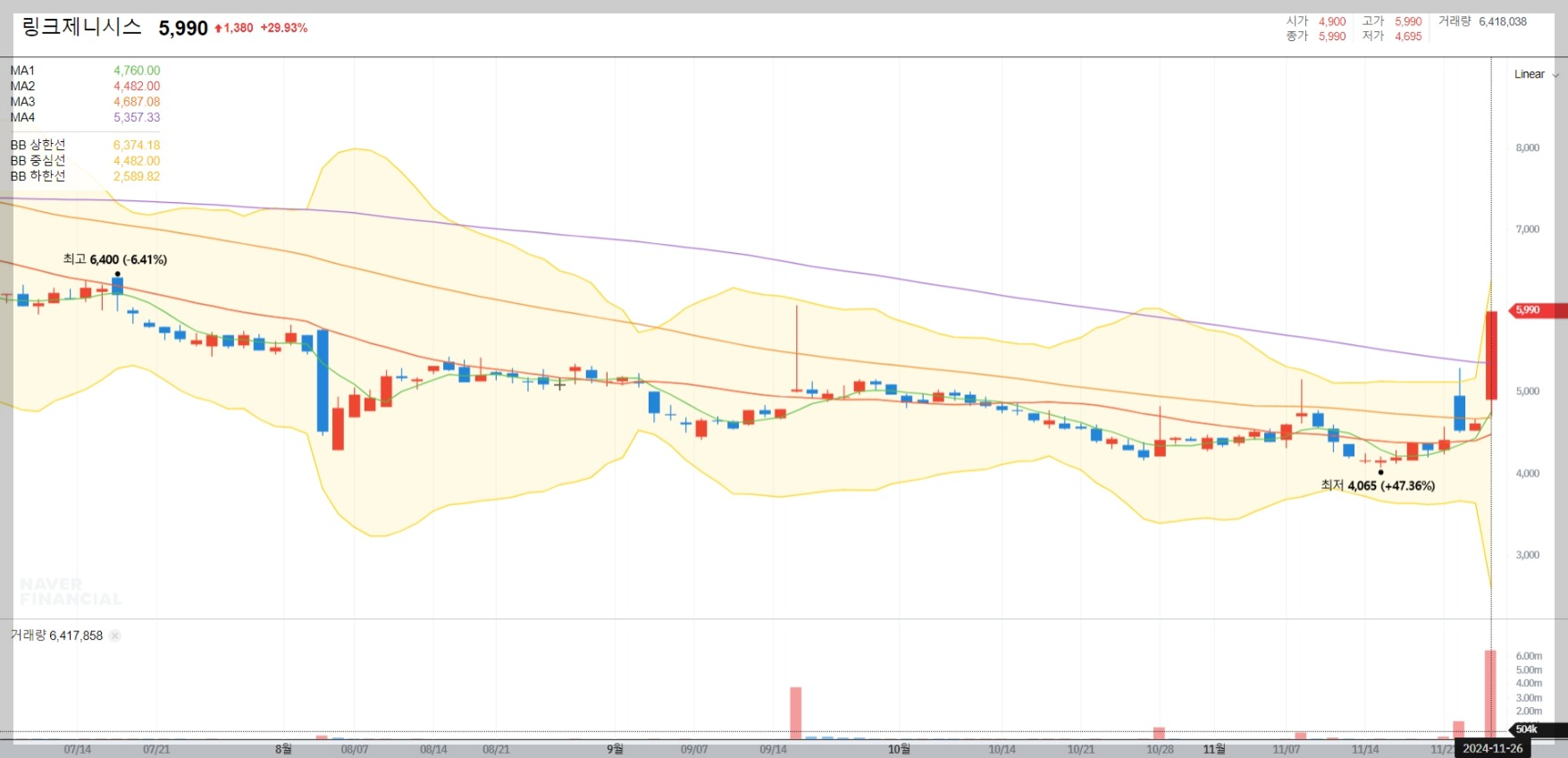 2024년 11월 기준 링크제니시스의 주가는 5,990원으로 전일 대비 29.93% 상승했습니다. 이는 최근 기술적 호재와 시장 기대감이 반영된 결과입니다.