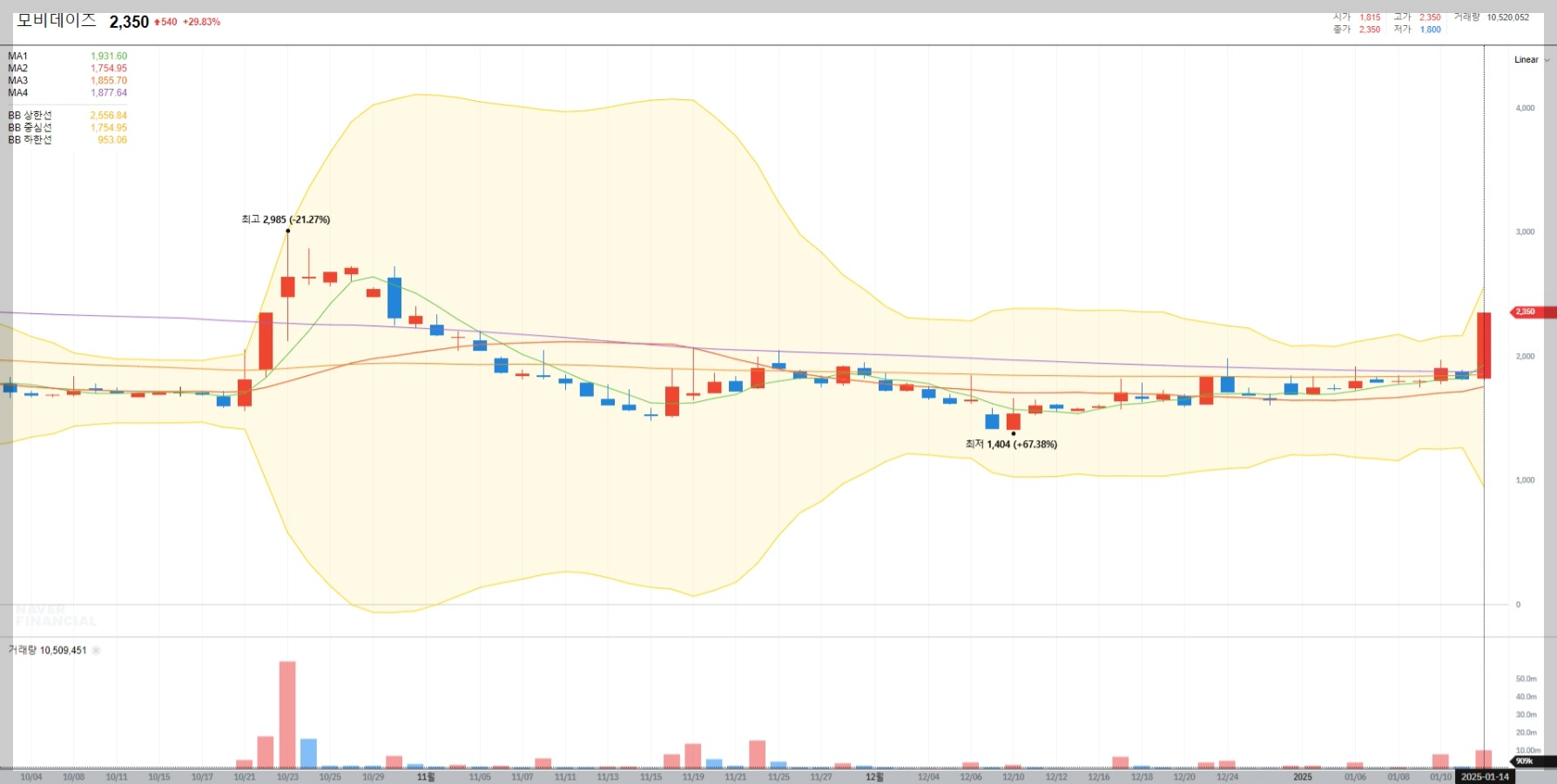 2025년 1월 14일 기준 모비데이즈의 주가는 상한가를 기록하며 2,350원에 거래되고 있습니다. 이는 최근 한 달 동안 약 28% 상승한 수치로, 투자자들의 기대감이 반영된 결과입니다.