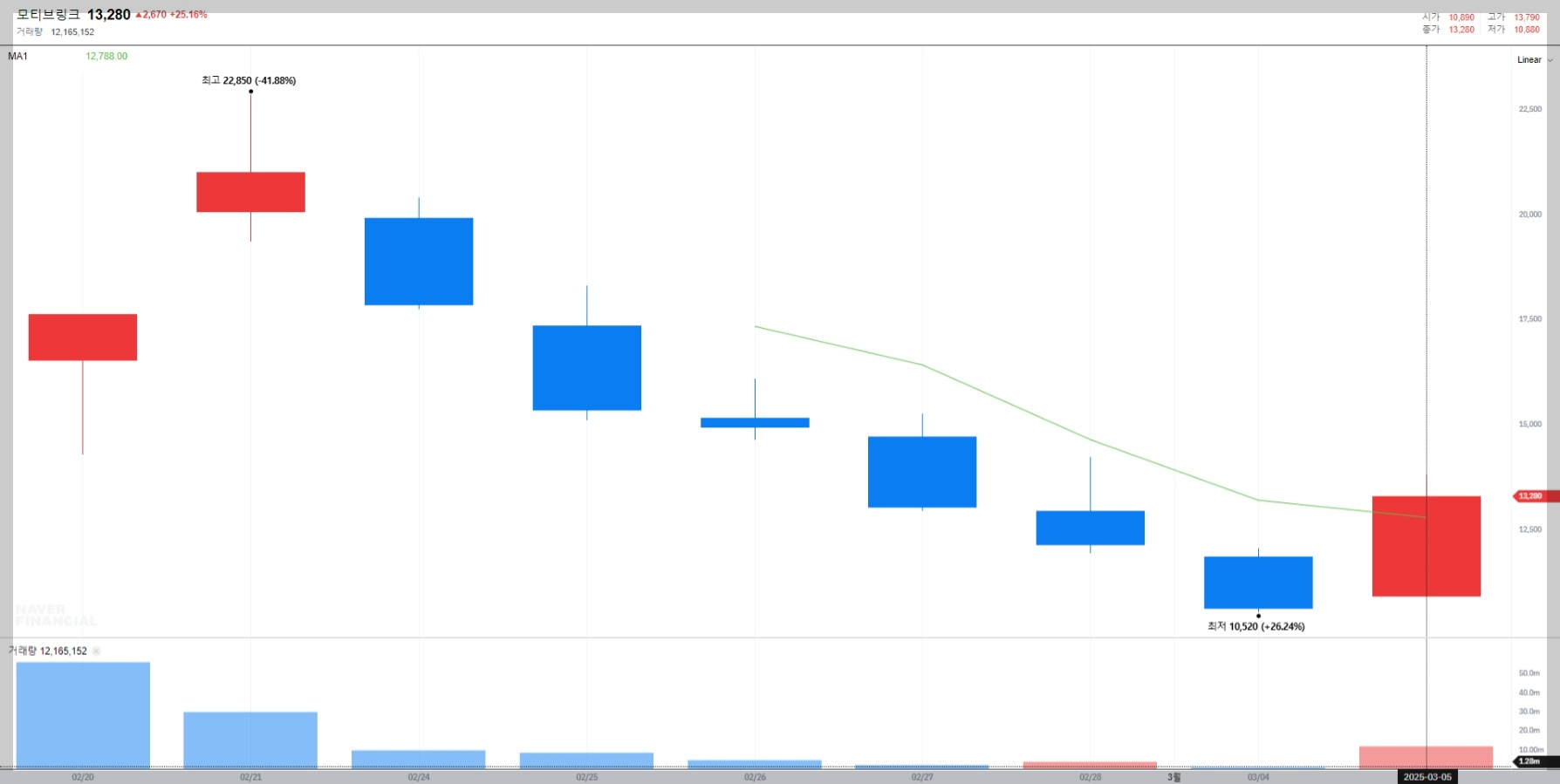 2025년 3월 5일 기준 모티브링크의 종가는 13,280원으로 기록되었습니다. 최근 하락세를 보였으나 기술적 반등 가능성이 점쳐지고 있습니다.