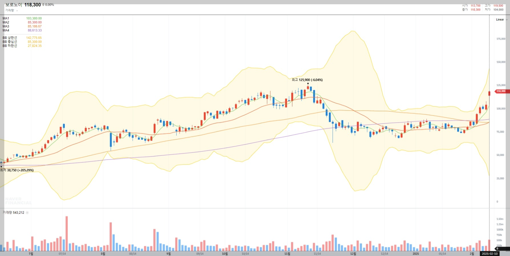 보로노이의 현재 주가는 118,300원으로 최근 상승세를 보이고 있습니다. 특히 2025년 2월 들어 거래량이 급증하며 강한 매수세가 유입되고 있는 모습입니다. 이는 투자자들의 기대감이 반영된 결과로 보입니다.
