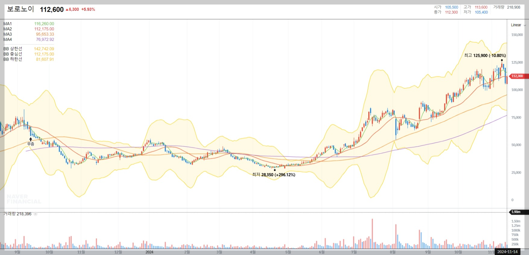 2024년 11월 14일 기준 보로노이의 주가는 112,600원으로 마감되었습니다. 이는 전일 대비 5.93% 상승한 수치입니다. 최근 몇 달간 보로노이의 주가는 꾸준한 상승세를 유지하고 있으며, 최고가는 125,900원에 달했습니다.