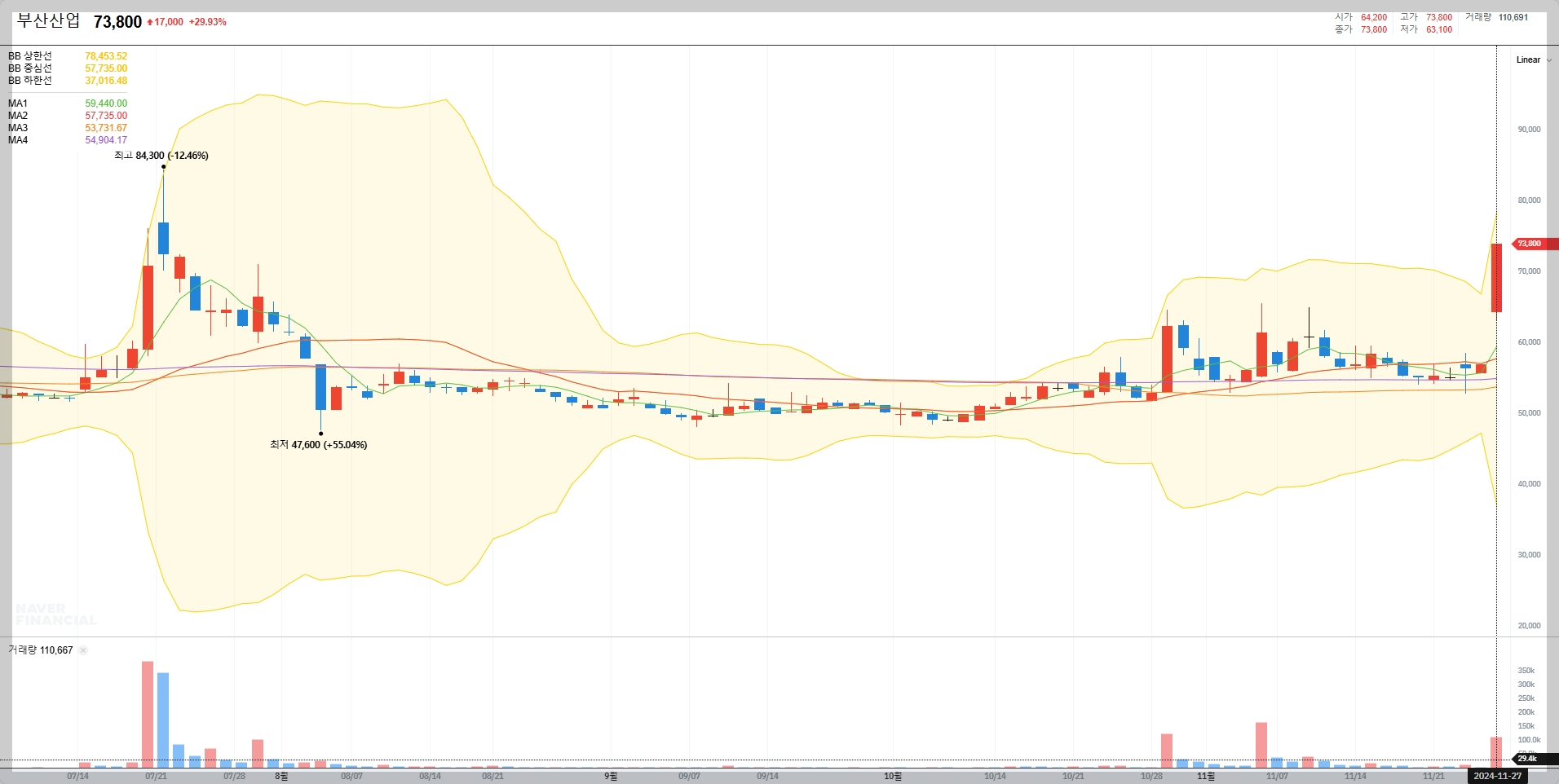 부산산업의 현재 주가는 73,800원으로 전일 대비 29.93% 상승했습니다. 이는 최근 거래량 증가와 함께 투자자들의 높은 관심을 반영한 결과로 보입니다.