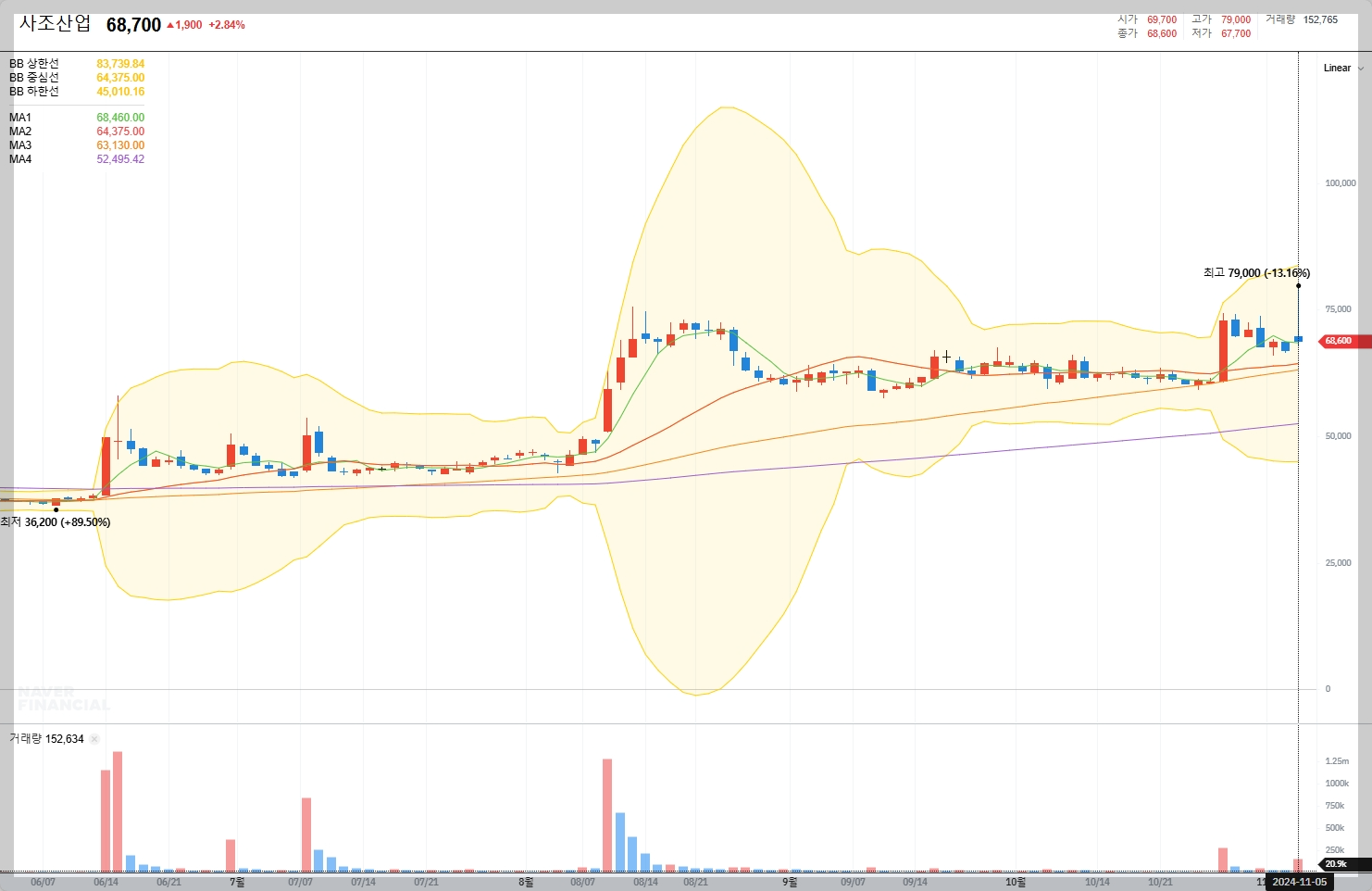 2024년 11월 5일 기준, 사조산업의 주가는 68,700원으로 전일 대비 2.84% 상승했습니다.