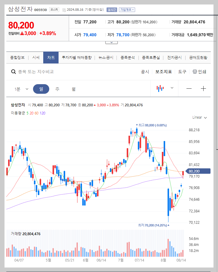 삼성전자 현재 주가는 80,200원이며 전일 대비 3,000원 상승한 모습을 보이고 있습니다. 삼성전자의 주주현황을 살펴보면 삼성생명보험 주주가 전체 지분 20.08%를 소유하고 있습니다. 삼성전자는 반도체 및 관련장비 기업으로 장중 기준으로 주가는 80,200원입니다. 삼성전자의 시가 총액은 478조 7766억 원이며 발행 주식수는 5,969,782,550주입니다. 외국인 보유 비중은 56.26%이며 장중 거래량은 22,061,478원 을 기록했습니다. 매출액은 719,156억 원을 달성했습니다. EPS는 2,899원이며 삼성전자 주식 배당수익률은 1.80%입니다.