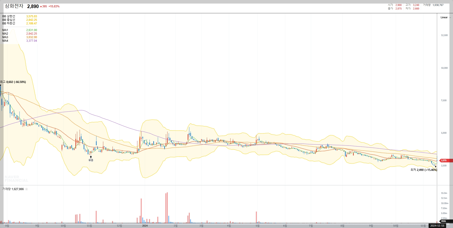 2024년 11월 15일 현재, 삼화전자의 주가는 2,890원으로, 전일 대비 15.83% 상승하였습니다. 이는 최근 몇 달간 지속된 하락세에서 회복하는 추세를 나타내지만, 여전히 2023년 초에 비해 낮은 수준을 유지하고 있습니다.