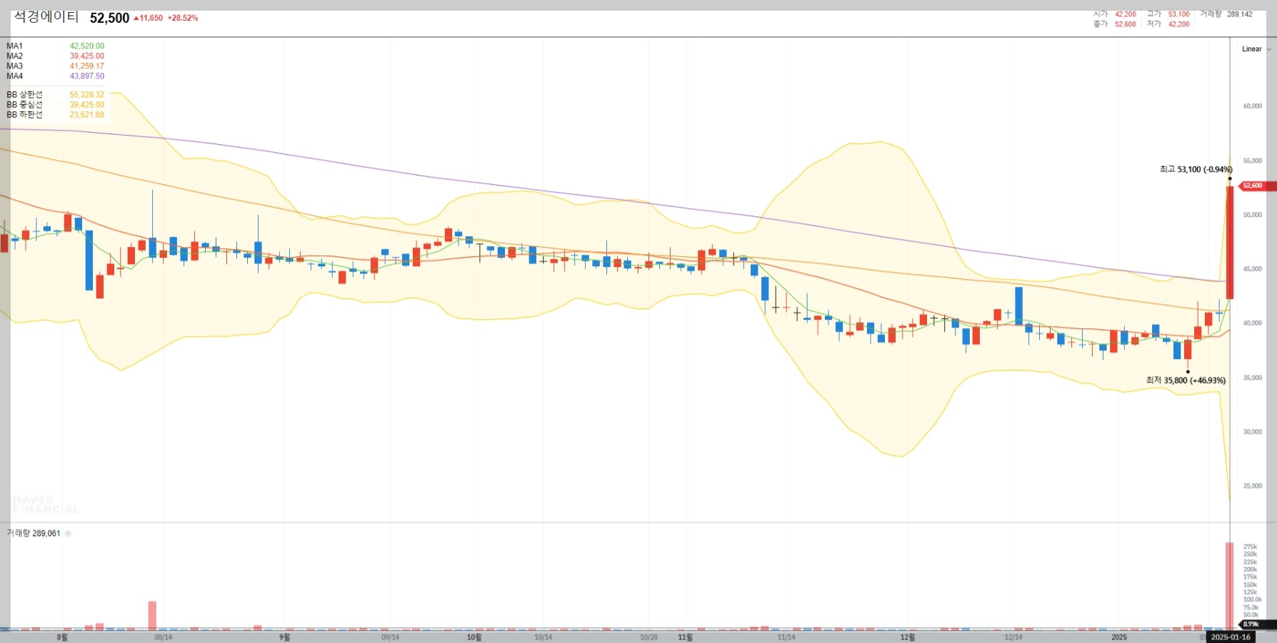2025년 1월 16일 기준 석경에이티의 현재 주가는 52,500원으로 전일 대비 28.52% 급등했습니다. 이는 최근 투자자들의 매수세 증가와 긍정적인 시장 전망 때문으로 보입니다.