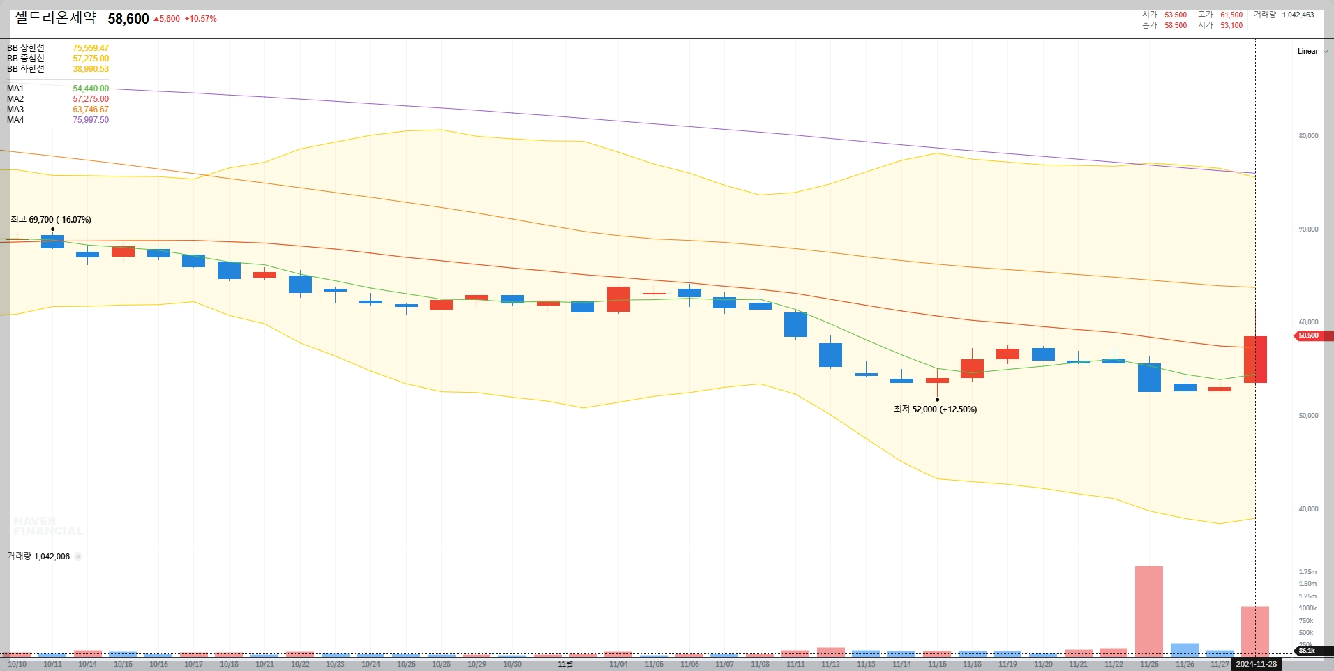볼린저밴드 기준으로 현재 하단 지지선에서 반등하는 모습을 보이고 있어, 기술적 분석 관점에서 매수 시그널이 발생하고 있습니다.