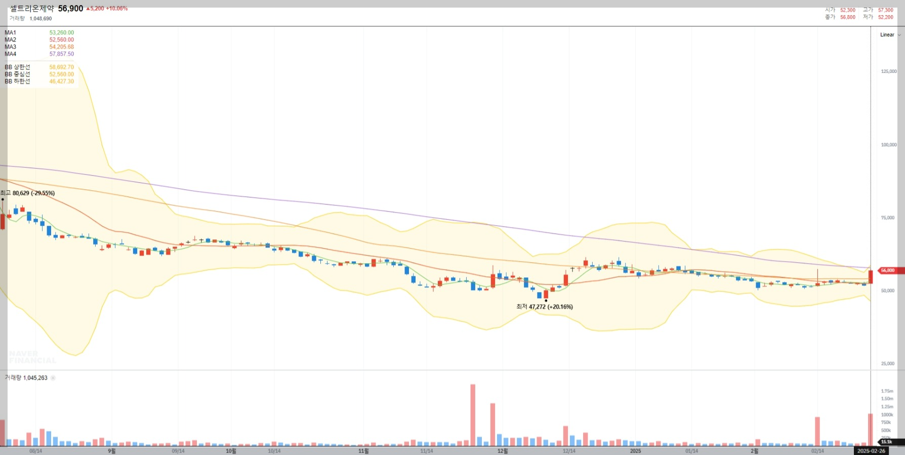 2025년 2월 26일 기준 셀트리온제약의 종가는 56,900원으로 기록되었습니다. 최근 몇 달간 하락세를 보였으나, 반등 조짐이 나타나고 있습니다. 거래량 증가와 함께 기술적 지표들이 긍정적인 신호를 보내고 있는 상황입니다.