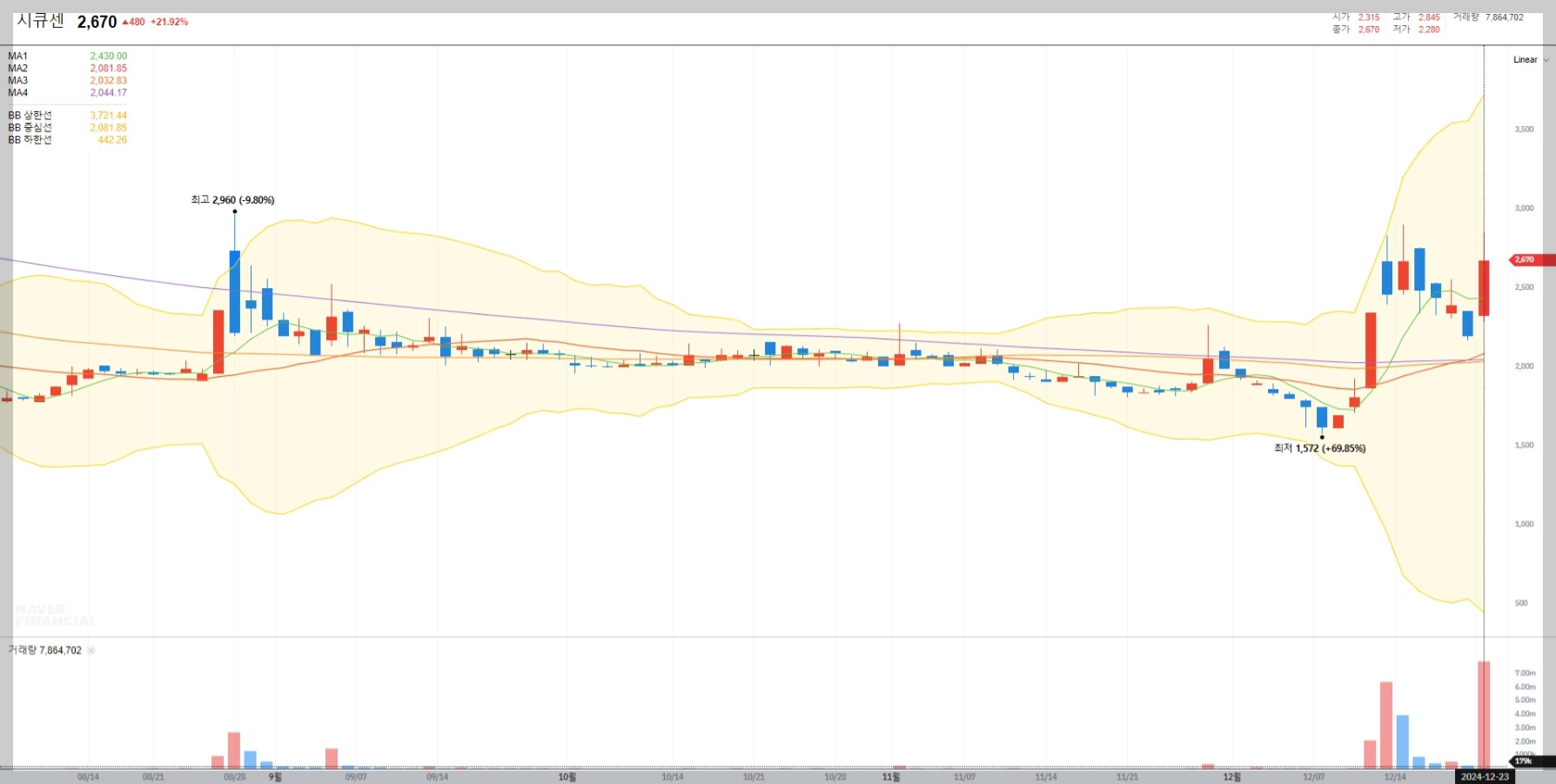 2024년 12월 23일 기준 시큐센의 종가는 2,670원으로 전일 대비 21.92% 상승했습니다. 최근 거래량 증가와 함께 볼린저 밴드 상단을 돌파하며 강한 상승세를 보이고 있습니다.