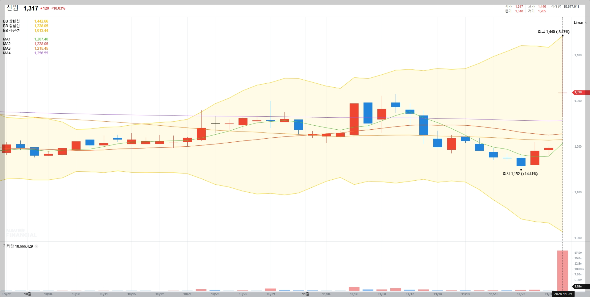 현재 신원의 주가는 1,317원으로 전일 대비 10.03% 상승했습니다. 이는 단기적인 기술적 반등으로 보이며, 거래량도 평소보다 크게 증가한 18,677,011주를 기록했습니다.