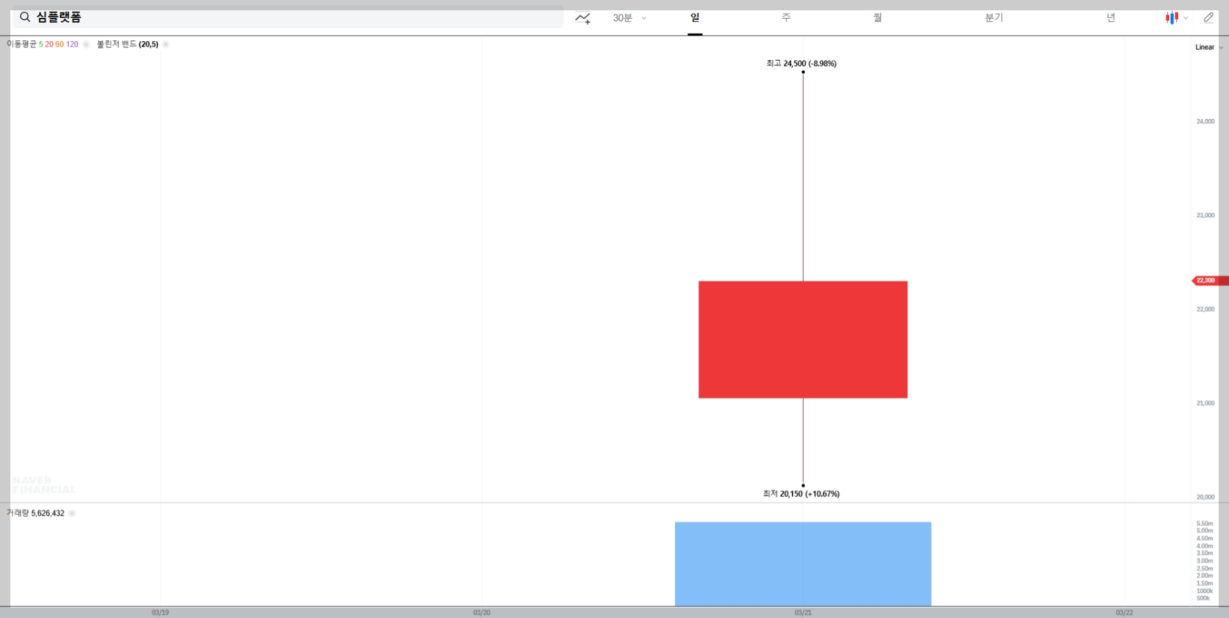 볼린저밴드는 이동평균선을 중심으로 한 상한선과 하한선을 통해 주가 변동폭을 예측하는 보조지표입니다. 현재 심플랫폼의 급등세는 볼린저밴드 상단 돌파를 보여 강한 매수 신호로 해석될 수 있습니다. 그러나 과열된 상태에서는 하단선을 돌파할 위험도 있으므로 단기 매매 전략이 필요합니다.