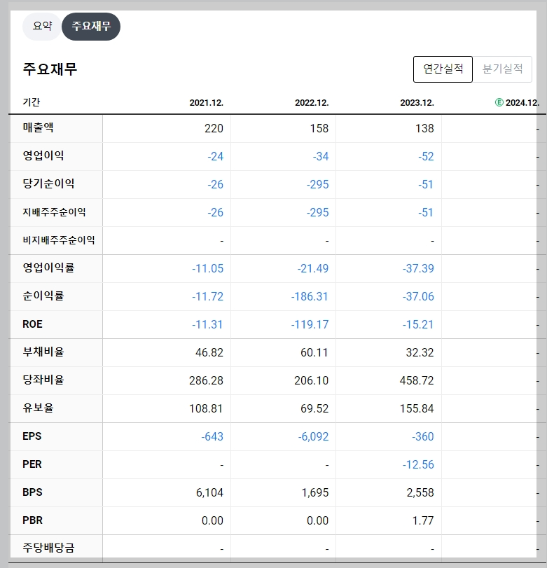 - 2023년 매출액: 138억 원 (전년 대비 감소)