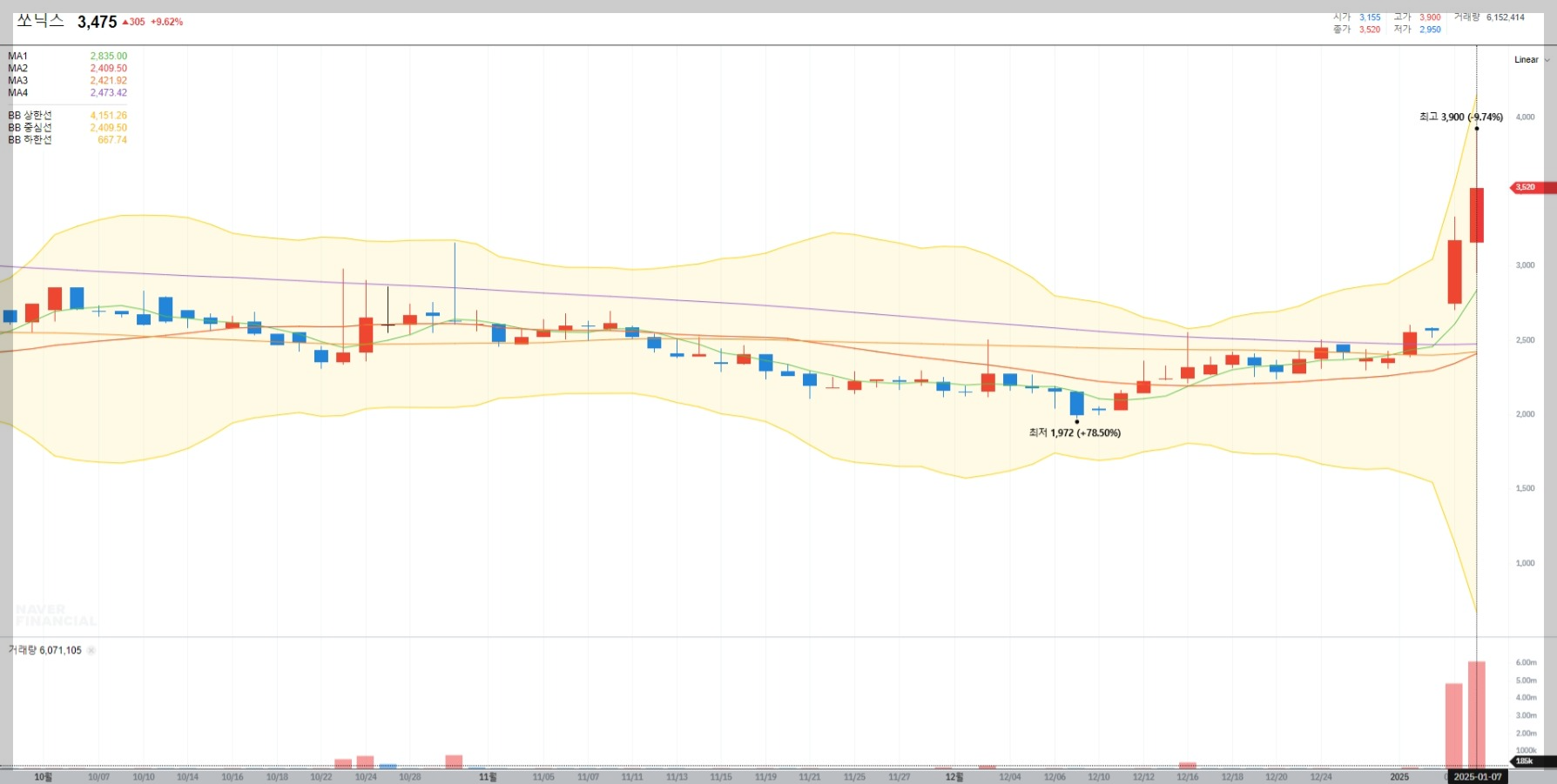 2025년 1월 7일 기준 쏘닉스의 주가는 3,475원으로 전 거래일 대비 9.62% 상승했습니다. 최근 거래량 증가와 함께 급등세를 보이며 투자자들의 관심이 집중되고 있습니다.