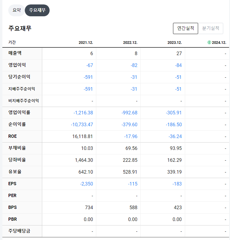 2023년 기준 쓰리빌리언의 매출액은 27억 원으로 전년 대비 크게 증가하였으나 영업 손실은 여전히 -84억 원으로 적자를 기록하고 있습니다. 순손익률 또한 -186.50%로 개선이 필요합니다.