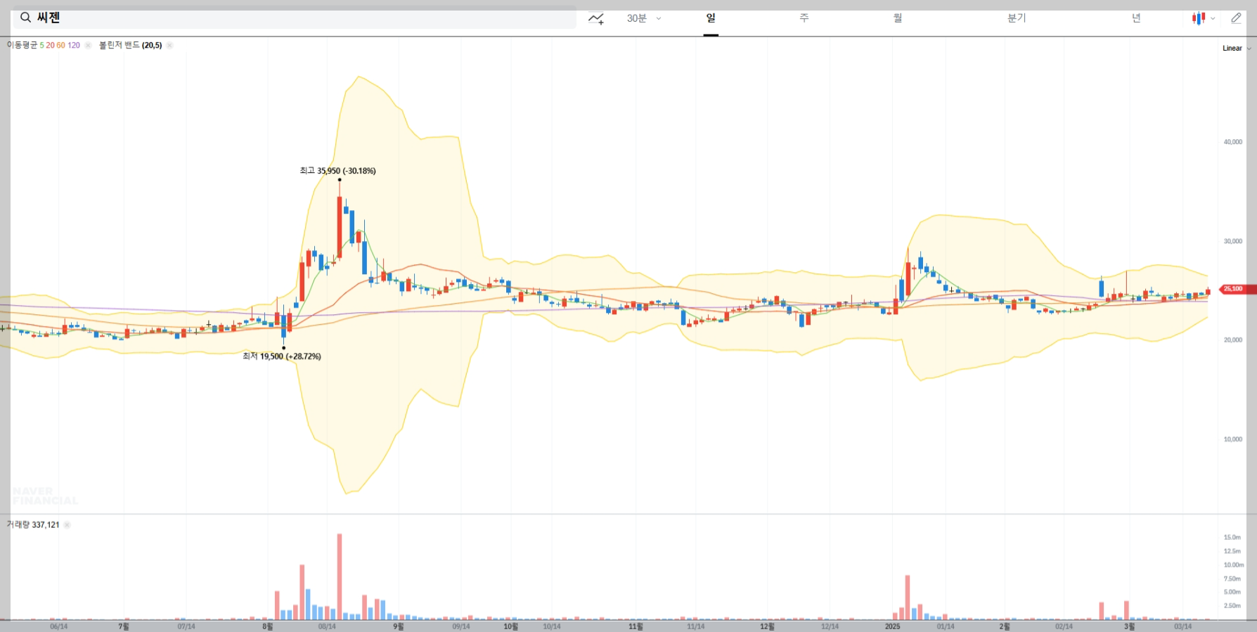 2025년 3월 20일 기준 씨젠의 종가는 25,100원으로 전일 대비 2.03% 상승했습니다. 이는 최근 시장의 긍정적인 반응과 함께 단기적으로 상승세를 보이는 모습입니다.