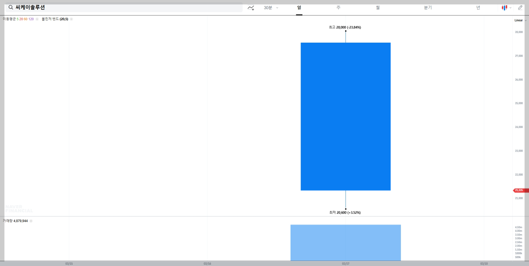씨케이솔루션의 현재 주가는 21,050원으로 공모가 대비 약 40% 상승한 상태입니다. 이는 시장의 높은 기대감을 반영한 결과로 보입니다.