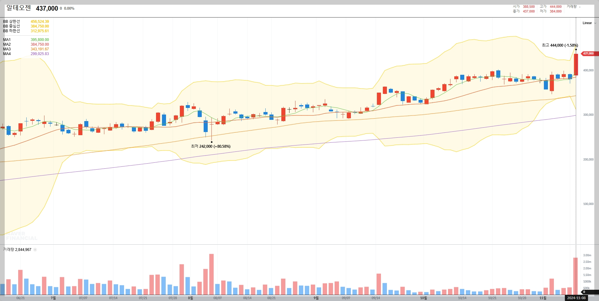 2024년 11월 11일 기준, 알테오젠의 주가는 437,000원을 돌파했습니다. 이는 전년 대비 약 15% 상승한 수치로, 최근의 긍정적인 뉴스와 실적 개선 기대감이 반영된 것으로 보입니다.