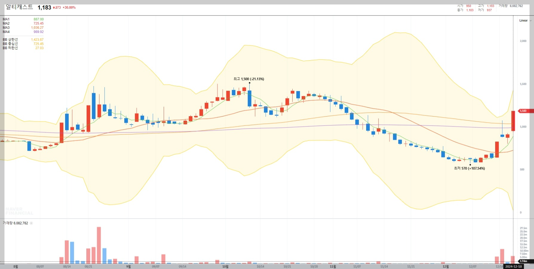 2024년 12월 18일 기준 알티캐스트의 종가는 1,183원으로 전일 대비 30% 상승하며 상한가를 기록했습니다. 최근 거래량은 약 608만 주로 활발한 거래가 이루어지고 있습니다.