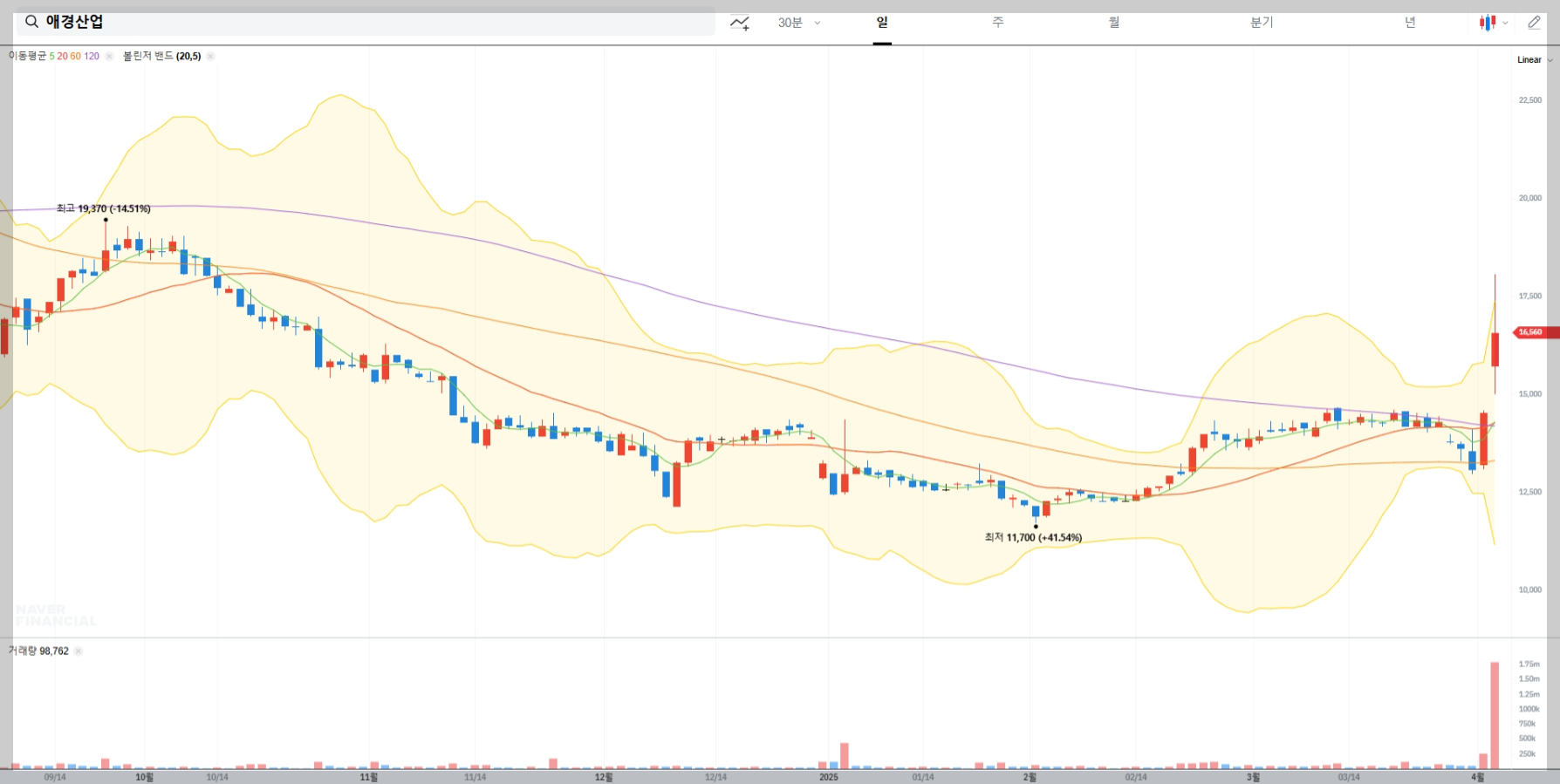 애경산업의 현재 주가는 16,570원으로, 오늘(2025년 4월 2일) 기준 14.28% 상승했습니다. 이는 최근 몇 개월간의 주가 흐름을 고려할 때 상당히 큰 폭의 상승입니다. 거래량 또한 평소보다 증가한 모습을 보이고 있어, 시장의 관심이 집중되고 있음을 알 수 있습니다.