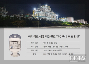 • 2025년 말까지 총 967억원을 투자해 아라미드 섬유 핵심원료인 TPC(TerePhthaloyl Chloride) 양산 설비 구축 계획 발표
