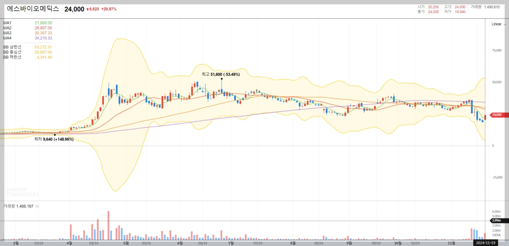 2024년 11월 19일 기준 에스바이오메딕스의 주가는 24,000원으로 전일 대비 29.87% 상승했습니다. 이는 최근 긍정적인 임상 결과 발표와 관련된 기대감이 반영된 것으로 보입니다.