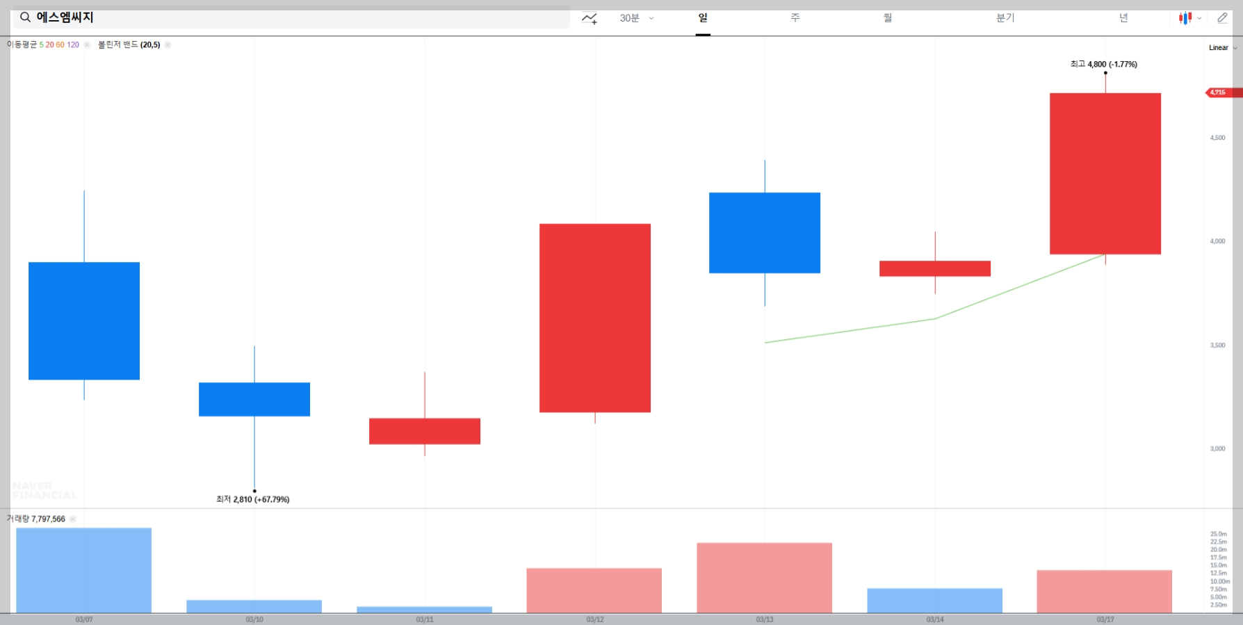 2025년 3월 17일 오전 11시 기준 에스엠씨지의 주가는 4,635원으로 전일 대비 18.69% 상승했습니다. 이는 투자자들의 강한 매수세를 반영한 결과로 보입니다.