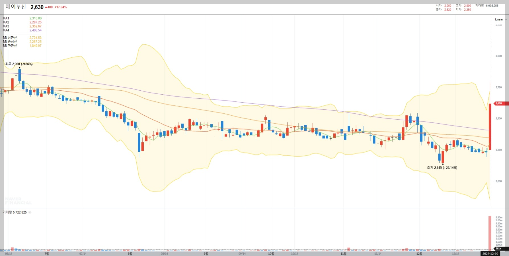 2024년 12월 30일 기준 에어부산의 주가는 2,630원으로 전일 대비 17.94% 상승했습니다. 이는 최근의 호재와 실적 개선이 반영된 결과로 보입니다. 시가총액은 약 3,103억 원이며 외국인 보유 비중은 1.77%입니다.