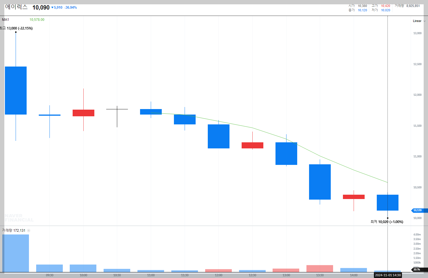 에이럭스의 주가는 상장 첫날 공모가에 비해 36.94% 하락하여 10,090원에 거래되고 있습니다. 이는 상장 초기에 주가 변동성이 크다는 것을 나타냅니다.