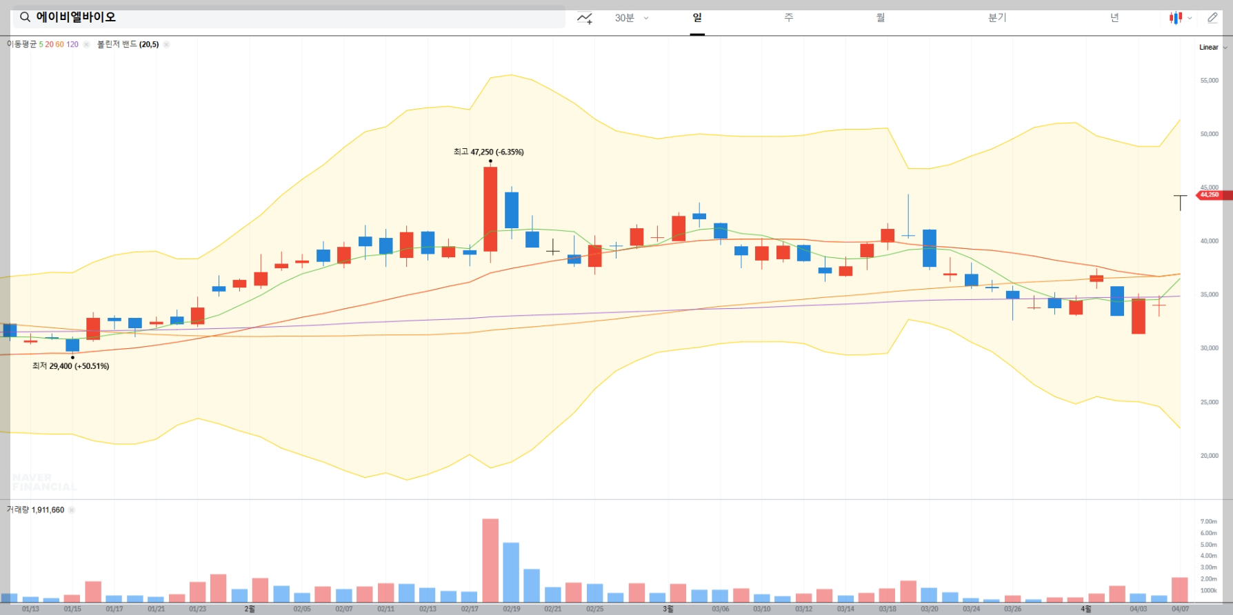 현재 에이비엘바이오의 주가는 44,250원으로 거래되고 있습니다. 특히 주목할 점은 장 전 시간 외 거래에서 50,800원까지 상승하며 전일 대비 6,550원(+14.80%) 상승한 모습을 보이고 있다는 것입니다. 이는 시장에서 에이비엘바이오에 대한 긍정적인 기대감이 형성되고 있음을 시사합니다.