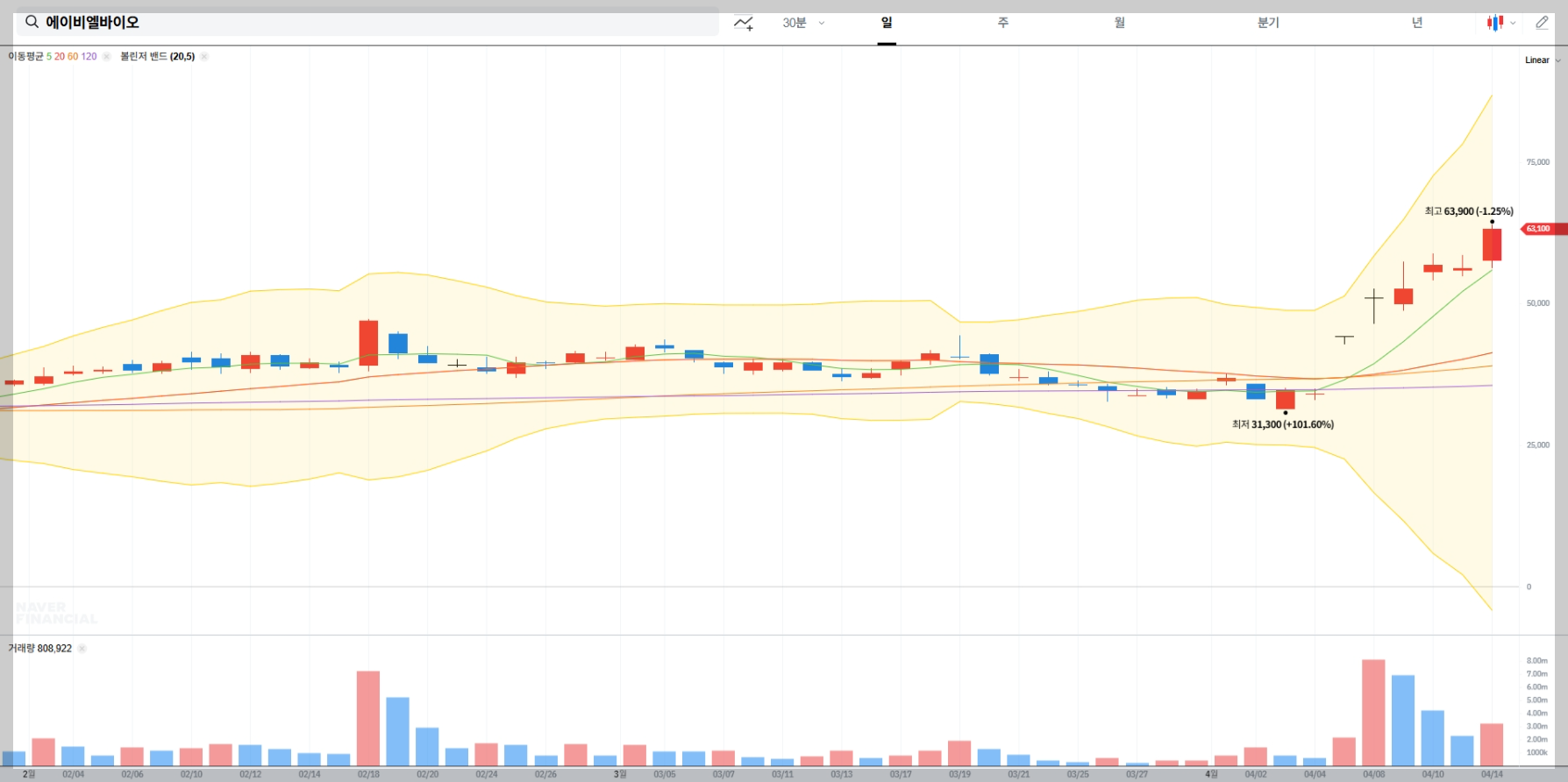 볼린저밴드를 활용한 기술적 분석 결과, 에이비엘바이오 주식은 현재 상단밴드에 근접하며 강한 상승 모멘텀을 보여주고 있습니다. 20일 이동평균선을 기준으로 상승 추세가 확인되며, 밴드 폭이 넓어지는 추세는 변동성 확대를 의미합니다.